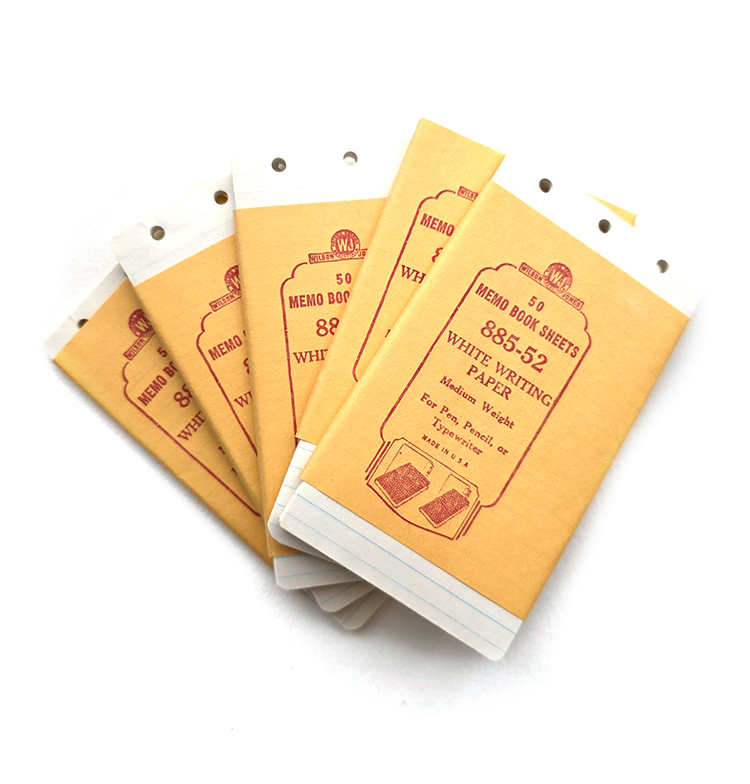 3 hole punched, 2.5 x 4.5 inches, come wrapped in yellow branded packaging.