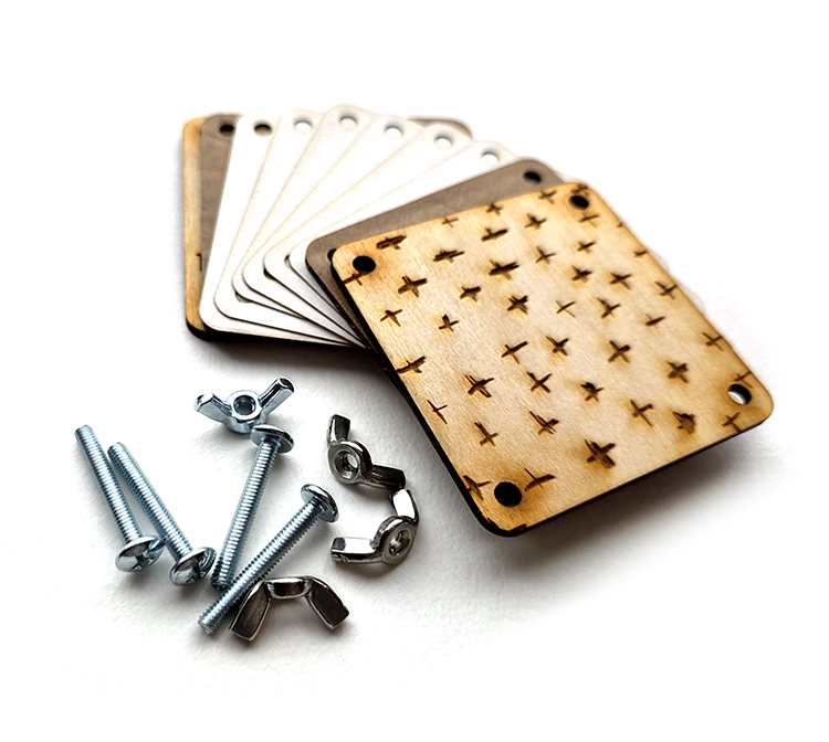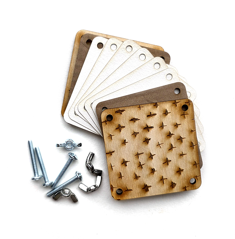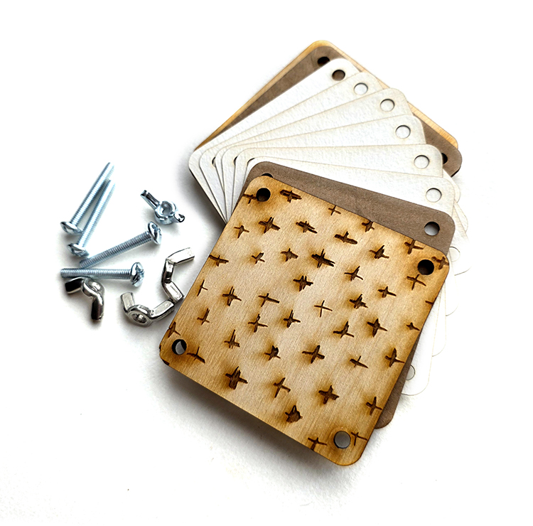 Contains : 2 outside wooden pieces, 2 inside cardboard pieces, 6 watercolor paper pieces, 4 bolts & 4 wing nuts.